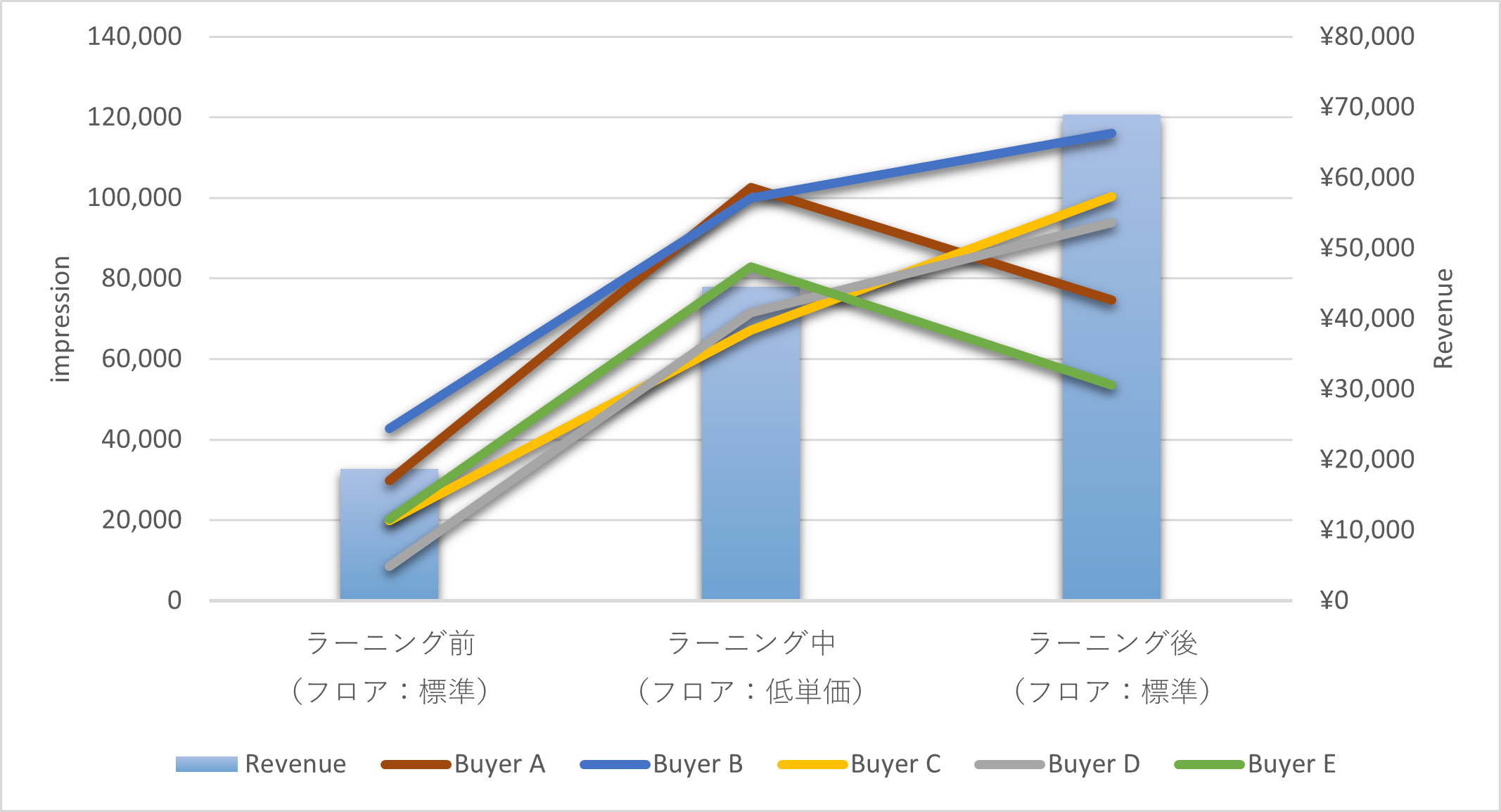 下図は”デマンドラーニング”を実施する前後での、各Buyerのimpression数の変化とそれらのBuyerの合算収益(Revenue)の推移になります。