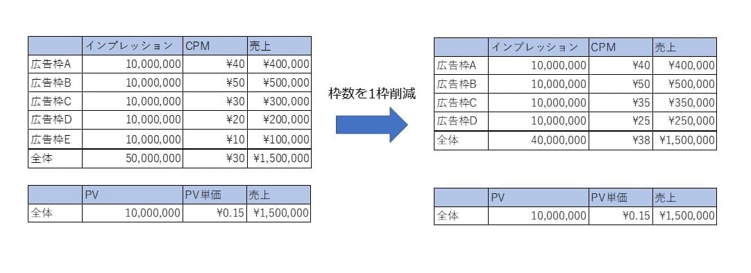 例えば10,000,000PVあり広告枠を5枠設置しているメディアから、収益性が低い広告枠Eを削減したことで、その他広告枠のCTRやドメインの視認率が上がり、広告枠Cと広告枠DのCPMが伸びたと想定します。その場合、各プラットフォームのレポートから取得できるのはimpressionベースの売上になってしまうため、1枠分のimpression数が減ることになり、CPMが高くなったように見えてしまいます。しかしPV単価には変動がなく、枠を減らしたことによりこの状況においては、全体のCPMは上がったものの、メディアの収益性は変わらなかったことになります。