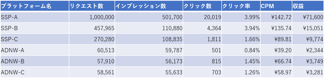 1枠に対して配信している広告プラットフォームのパフォーマンスを可視化することで、SSPのフロアプライスの調整や、アドネットワークの配信比率の調整などが可能になり、細かな運用が可能になり収益の最適化が可能になります。